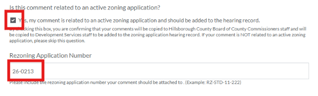 Be sure to check the box indicating this is related to an active zoning application, and include the correct Application Number (26-0213):