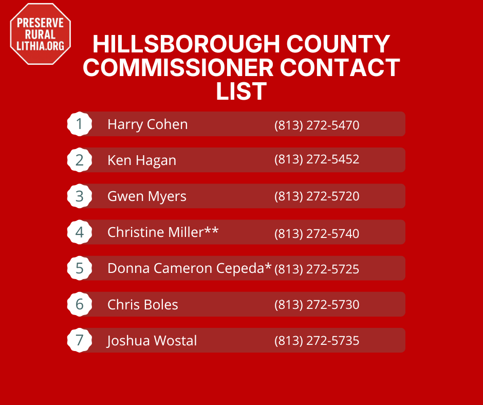We’ve created a contact list for all 7 Hillsborough County Commissioners, and we need everyone to start calling each one to voice opposition to the proposed rezoning on Boyette Road – Application #26-0213.